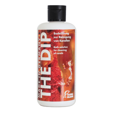 FAUNA MARIN THE DIP ist eine hochaktive Badelösung zur Reinigung von Korallen und hilft bei der Eingewöhnung von neu eingesetzten Tieren. THE DIP reinigt sicher alle SPS- und LPS-Korallen von uner-wünschten Belägen und Begleitern.